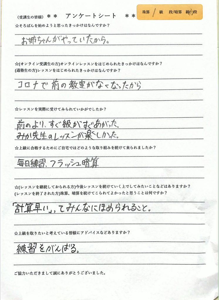 今回妹のNちゃんがアンケートに答えてくれました。Nちゃんは、暗算力が大変高く、クラスでもぶっちぎりの1位だそうです。すごい!!👍