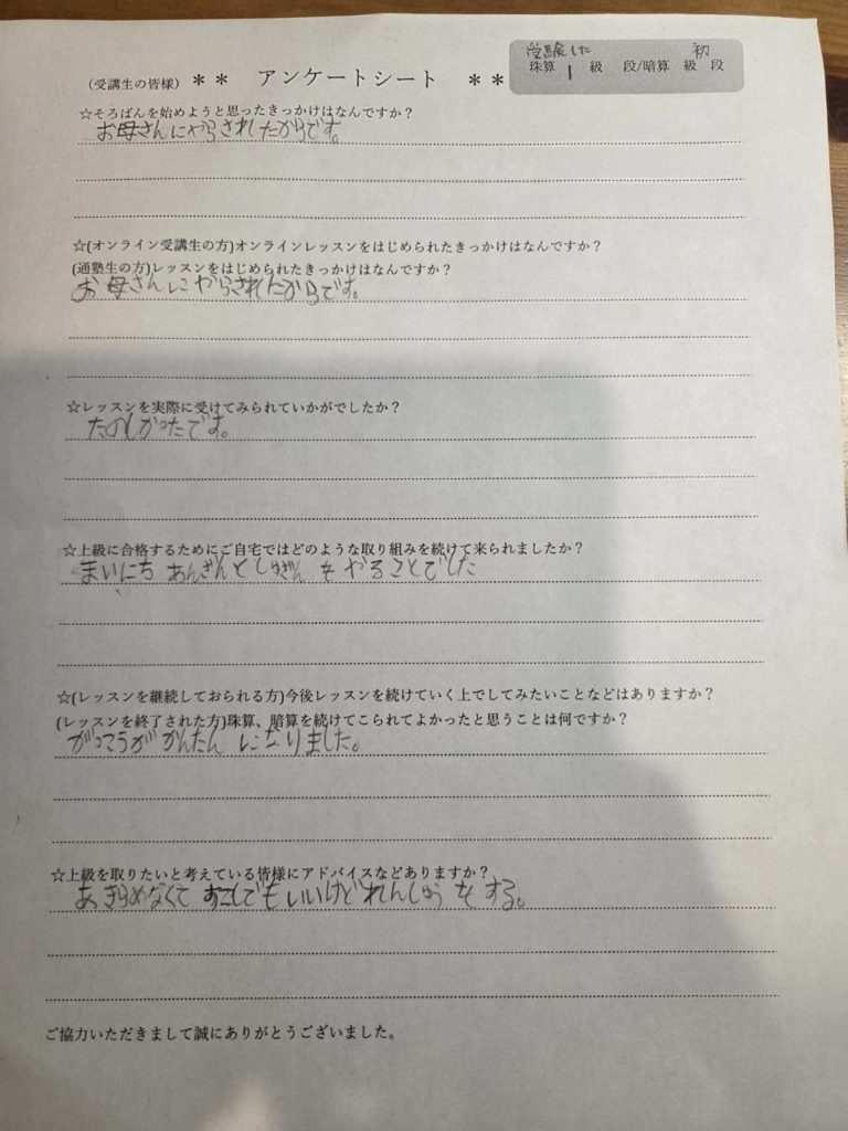 海外生活が長いK君は、英語の方が得意とのことですが、いつものレッスンでも日本語の聞き取りや、今回のアンケートも頑張って日本語で書いてくれましたよ。本当にどうもありがとう!