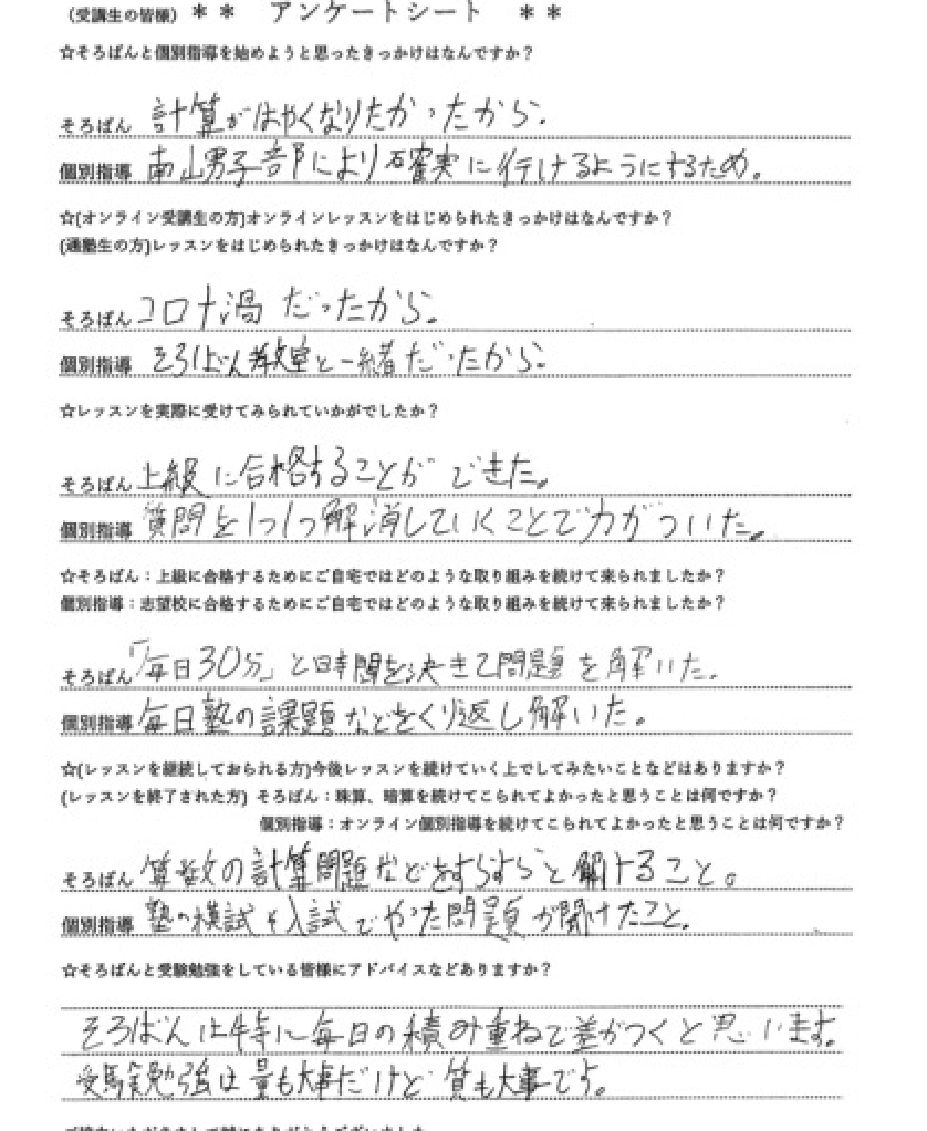 そろばんと個別指導をご利用で見事、珠算は1級合格、中学受験では、南山中学、名古屋中学と愛知中学は特待生への合格を勝ち取りました。